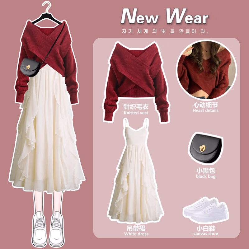 拉夏贝尔连衣裙女装新品2022春季新款韩版时尚针织收腰显瘦小个子套装裙 红色 M